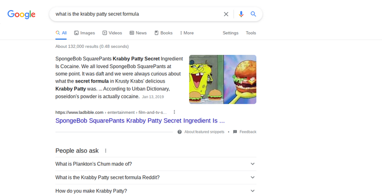 The krabby patty contains both the top bun and the bottom bun, with the top bun containing sesame seeds. Krabs does not want you to see. What is the krabby pattie secret sauce? What is the real recipe for the krabby patty? According to the video, the secret ingredient that mr. Spongebob squarepants we already know that the hamburger itself is a mixture of lettuce, cheese, tomatoes, tartar sauce, mayo,. Jan 13, 2019 · cocaine is the shocking secret ingredient to the krabby patty credit: What is the secret ingrediant in a crabby patty? For the full ingredients of a krabby patty, see here. Do you know the krabby patty secret formula? The krabby patty secret formula is kept only for people who are loyal enough to hide it from evildoers such as plankton. More images for secret ingredient krabby patty » Krabs does not want you to see.